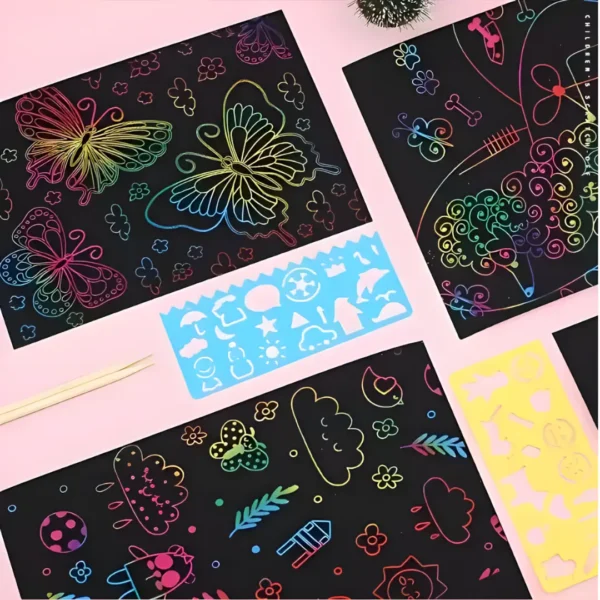 - No Mess, All Fun: Say goodbye to messy paints, ink stains, and crayon marks. This scratch art set is completely clean, requiring only the paper and a stylus. It’s the perfect travel-friendly and easy-to-clean-up art activity.