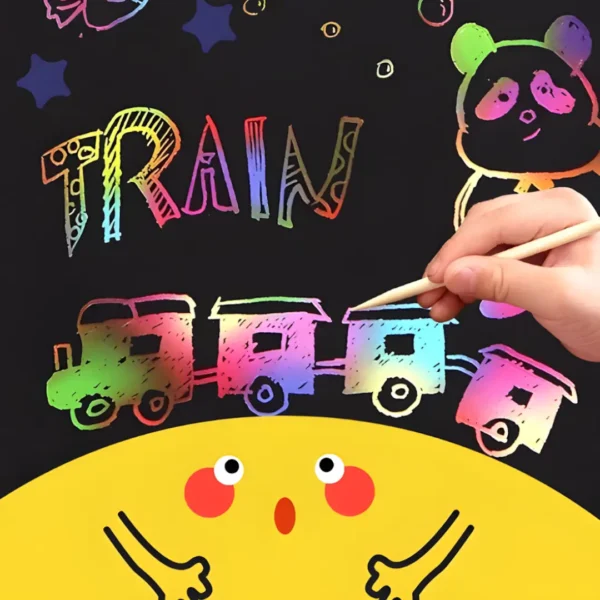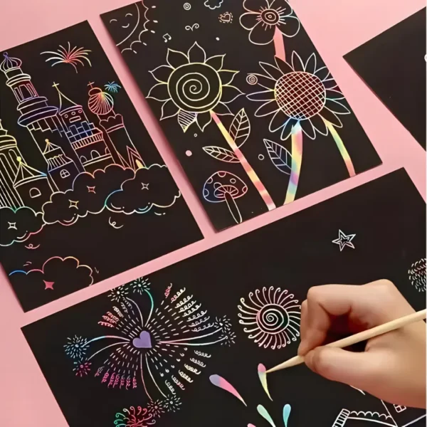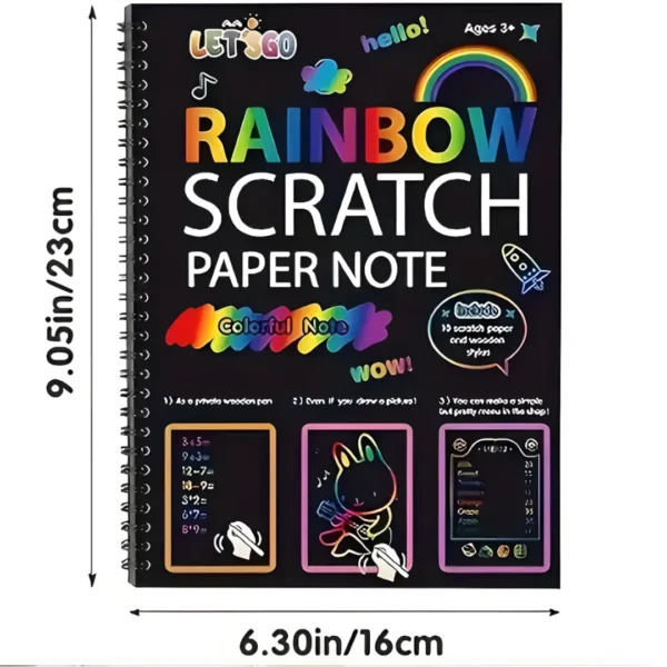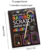 - Magical Rainbow Reveal: The magic is in the scratching! Simply use the included wooden stylus to etch into the black surface, and vibrant rainbow colors will appear underneath. It’s an exciting and rewarding process for children.