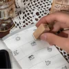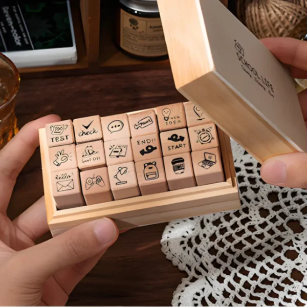 Housed in a charming wooden storage box, each set contains 18 unique rubber stamps. Depending on the theme you choose, you can stamp weather icons, travel symbols, memos, or daily schedule markers. They are the perfect size to fit into your planner grid, making them both functional and decorative.
