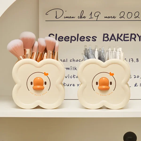 Bring a touch of luck and cheer to your workspace with our 4-Leaf Shape Duck Pen Holder! Say goodbye to cluttered desks and scattered stationery. This adorable and high-quality desktop organizer is designed to provide large-capacity storage in a compact, fun design. With its four distinct compartments shaped like a lucky clover and a charming duck theme, it’s the perfect accessory for students and anyone looking to keep their essentials neatly arranged and within easy reach.